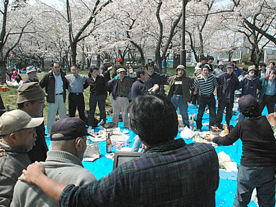 4月6日、成田市の三里塚第一公園で反対同盟主催の「団結花見の会」が盛大に開かれ、満開の桜の下で3・30集会の労をねぎらいあった。最後に全員で「♪誇りも高き農地死守」と『反対同盟の歌』を合唱した